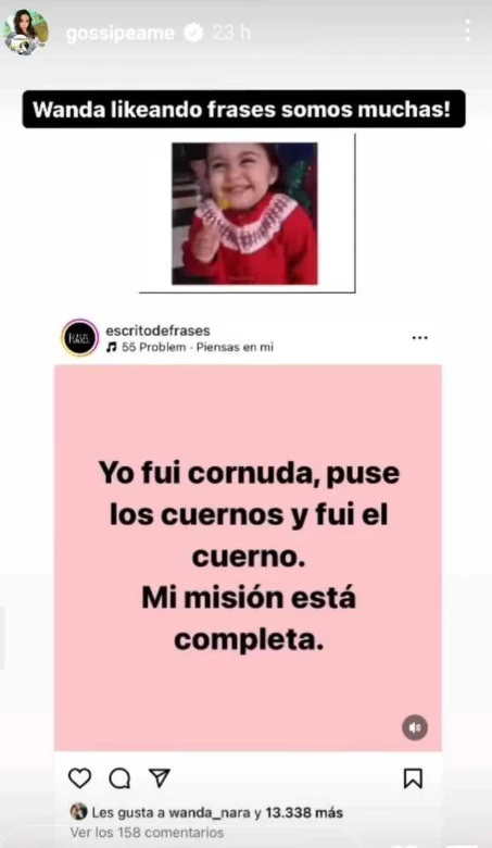 “Yo fui cornuda, puse los cuernos y fui el cuerno. Mi misión está completa”, reza la publicación que Wanda Nara avaló con su gesto y que Pochi de Gossipeame dio a conocer en su cuenta de Instagram.