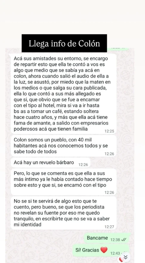"Llega info de Colón", anunció la panelista de Puro Show, al compartir el chat con data confidencial de ese “pueblo chico, infierno grande”, donde, dicen, la cosa no es tan naif como lo pintó la “no-amante” de Diego Latorre. "Acá, en sus amistades, su entorno, se encargó de repartir esto que ella te contó a vos", asegura esa persona.