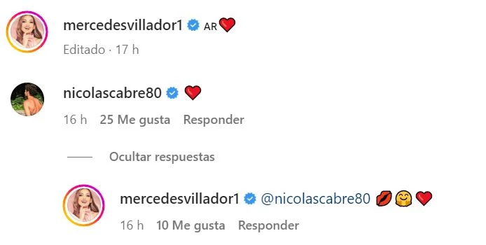 Pero eso no es todo, porque Mercedes eligió describir la imagen de una manera contundente: con un corazón rojo. A lo que Cabré, en respuesta, le dejo otro corazoncito. La escalada de amor y beboteo no quedó ahí: ella subió la apuesta y le recontestó con emoji de beso, abrazo y…otro corazoncito.