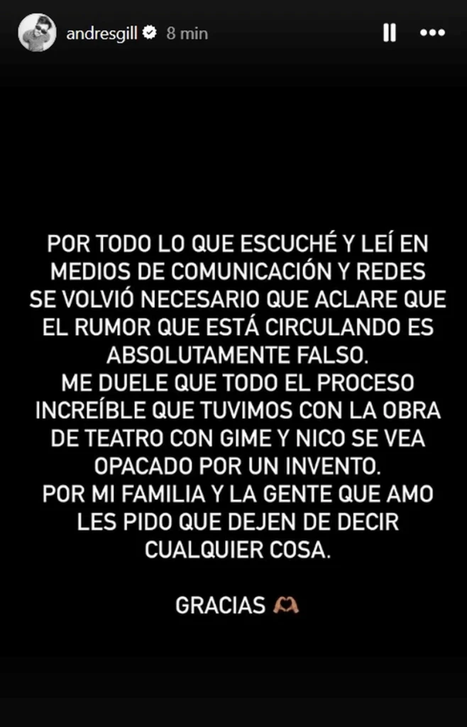 Gimena Accardi aclaró que su infidelidad ocurrió con una persona “random” y desligó de la situación a su compañero de teatro. Gil emitió un comunicado: “El rumor que está circulando es absolutamente falso. Me duele que todo el proceso increíble que tuvimos con la obra se vea opacado por un invento. Por mi familia y la gente que amo, les pido que dejen de decir cualquier cosa”, expresó.