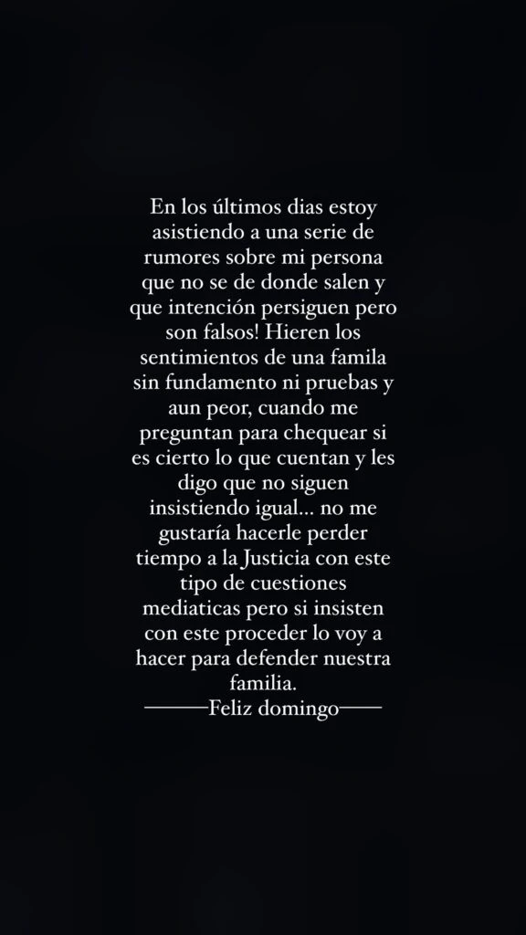 Tras el escándalo, y luego de mantener unos días de silencio, Carolina publicó una placa negra en sus historias de Instagram con un comunicado al respecto. "En los últimos días estoy asistiendo a una serie de rumores sobre mi persona que no sé de dónde salen ni qué intención persiguen, pero son falsos”, arrancó la rubia.