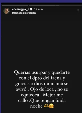 En la continuidad de esa revelación de secretos, la famosa añadió: "No se si me da gracia o lástima. Y a mi familia no la unió, al contrario, la desunió más. Payasa sos, das asco". Y luego Charlotte prendió la mecha de otra bomba: "Querías usurpar y quedarte con el departamento. Gracias a Dios mi mamá se dio avivó. Ojo de loca, no se equivoca". Y amenazó: "Mejor me callo".