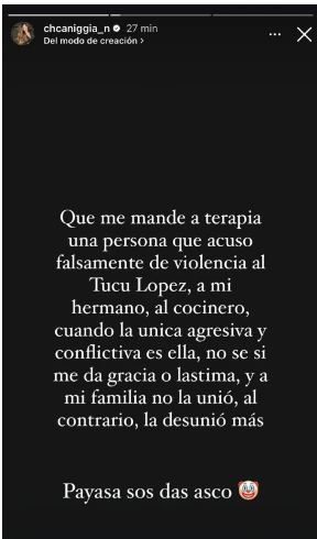 Charlotte no demoró ni un instante y explotó de bronca, por eso armó unas stories escandalosas. "Que me mande a terapia una persona que acusó falsamente de violencia el Tucu López, a mi hermano, al cocinero, cuando la única agresiva y conflictiva es ella", disparó.