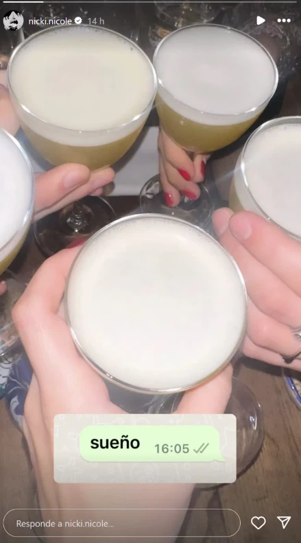 Eso transmitió Nicki Nicole en sus redes, al compartir en las últimas horas una foto de una de sus últimas salidas que deja ver varias copas en primer plano y una declaración de WhatsApp pasadas las cuatro de la tarde: “Sueño”.
