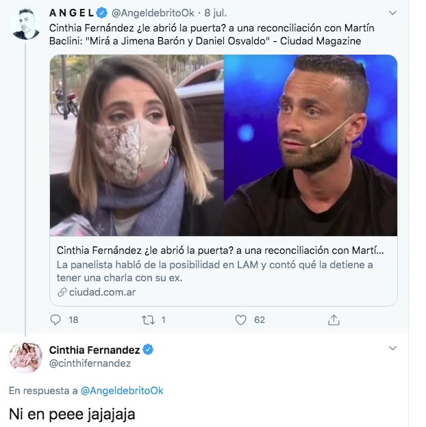 Todo indica que será imposible verlos juntos otra vez. Después de que las redes reaccionaran de buena manera a los acercamientos y los gestos que le bajaron la temperatura a una pelea infernal, y muchos manifestaran su deseo de verlos otra vez en pareja, ella les pateó el tablero: "Ni en pepe, jajaja" le contestó a Angel de Brito, quien había retuiteado una nota.