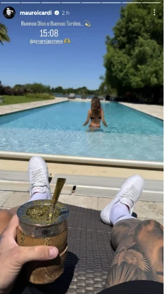 Las horas se acumularon desde esa resonante comunicación del noviazgo, sin embargo el delantero sintió la pulsión de volver a mostrar la intimidad del romance y posicionó su celular para capturar los detalles de la tarde, así colgó una instantánea con un mate en la mano y la China sumergida en la piscina kilométrica. Además escribió: "Buenos días, buenas tardes. 15:08".
