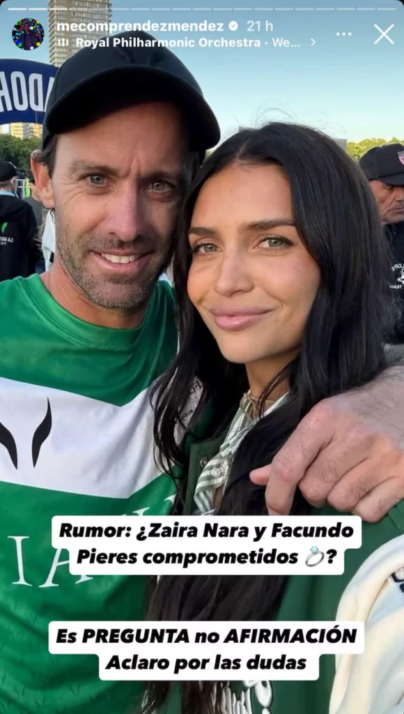 Un periodista fue uno de los primeros en hablar del tema en sus redes sociales. “Rumor: ¿Zaira Nara y Facundo Pieres comprometidos?”, escribió en su cuenta de X. Aunque no confirmó la noticia, su comentario llamó la atención de los seguidores de la pareja, que comenzaron a especular sobre la veracidad del dato.