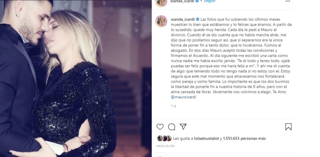 Ese posteo desapareció en las últimas horas, lo que sumado al repentino viaje de ella desde el centro de Francia hasta el norte de Italia multiplicó las versiones de ruptura en la pareja que parecía consolidada después de que la sacudiera ese tremendo temporal que se dio en llamar "Wandagate". Aquella vez, la ex vedette escribió lo que escribió en sus historias de Instagram y se desató el vendaval. La China Suárez quedó en el medio, y aunque en un comienzo dijo que no los conocía quedó claro que chateaba con el marido de Wanda.