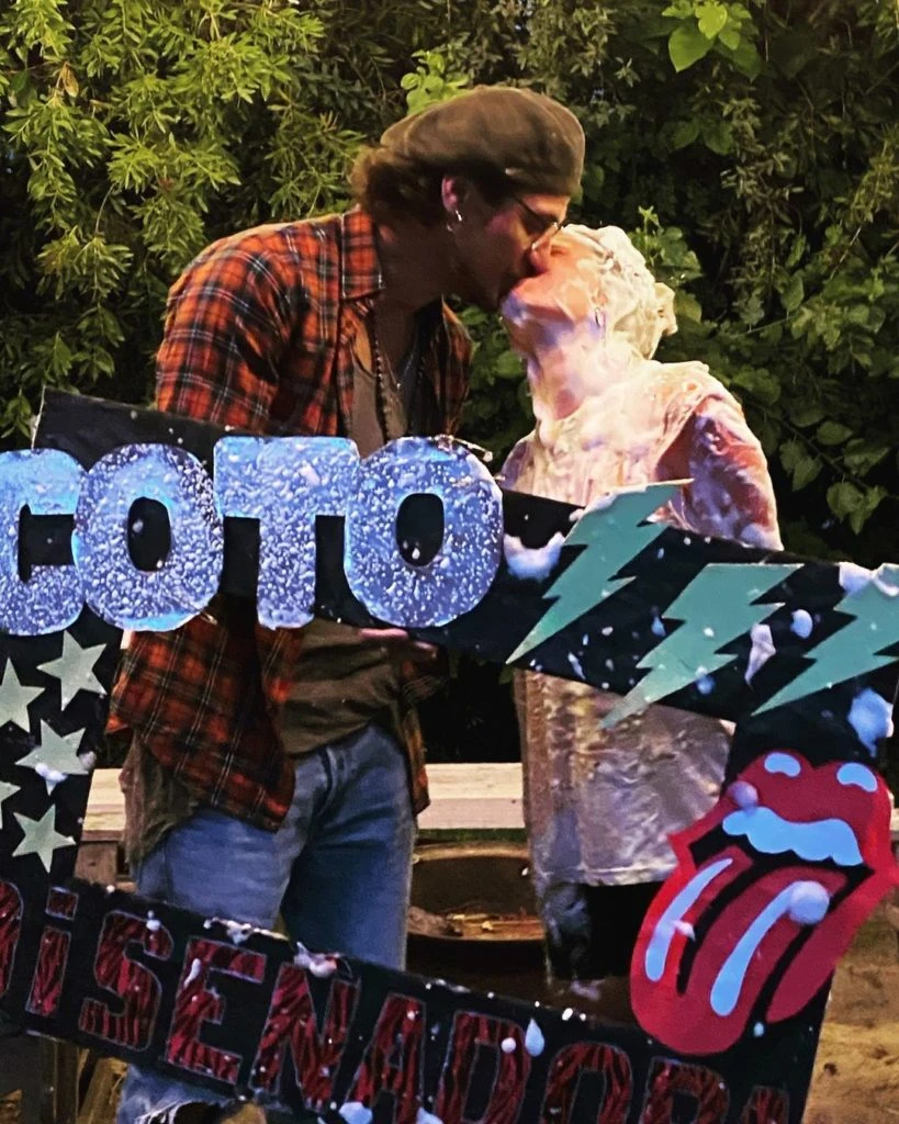 “¡Felicitaciones amor de mi vida, te amo!”, escribió el exnovio de Jimena Barón junto a una serie de fotos en las que aparece besándose con Constanza y sosteniendo un cartel cuyo marco dice: “Coto diseñadora”.