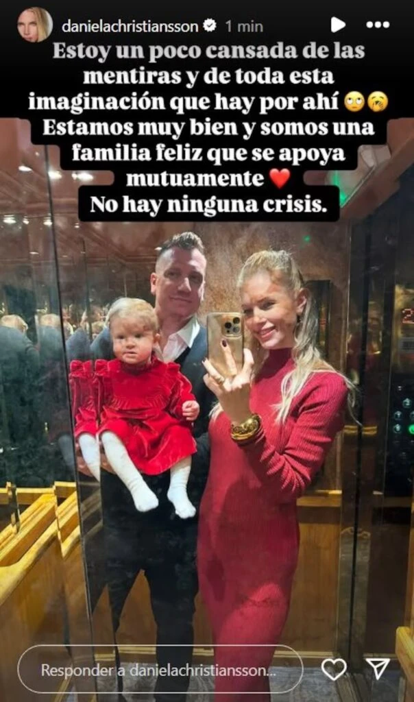 “Estoy un poco cansada de las mentiras y de toda esta imaginación que hay por ahí. Estamos muy bien y somos una familia feliz que se apoya mutuamente. No hay ninguna crisis”, expuso Christiansson en una historia que subió a su perfil, donde se la puede ver en una foto sonriendo junto a Maxi y su pequeña bebé.