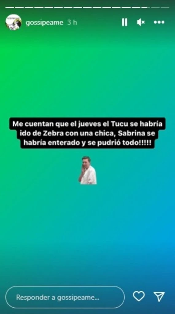 "Me cuentan que el jueves -fin de semana largo por Pascuas- el Tucu se habría ido de Zebra (un boliche en Córdoba, de los más conocidos) con una chica. Sabrina se habría enterado y ¡se pudrió todo!", aseguró Pochi de Gossipeame. Hay mar de fondo.