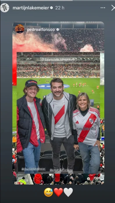 Hincha millonario, Pedro hizo debutar al rubio en el Estadio Monumental y así lo hicieron ver en una historia de Instagram donde aparecen juntos en Núñez. Fascinado con la experiencia futbolística, Martjin compartió la foto y sumó corazones rojos y blancos con un emoji que lo dice todo.