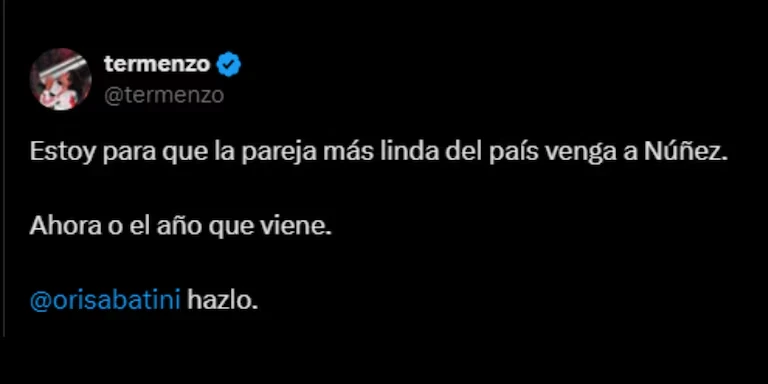 Entre varios usuarios y fanáticos del Millo que piden a Paulo, hubo un tuit que se hizo viral: “Estoy para que la pareja más linda del país venga a Núñez. Ahora o el año que viene. @orisabatini, hazlo”. Este anhelo también nació luego de que Juan Cortese haya confirmado que la dirigencia de River inició gestiones fuertes por varias figuras, entre ellas Dybala.