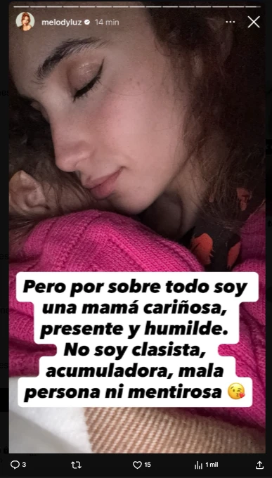 Nannis eligió una foto de una jarra de leche y escribió una frase desagradable: “Andá comprando el Nesquik porque la leche la pone el cocinero”. Melody reaccionó inmediatamente y posteó: “Para Nesquik estoy yo que soy bien negrita y villera”. Y luego agregó: “Sobre todo soy una mamá cariñosa, presente y humilde. No soy clasista ni mentirosa”.