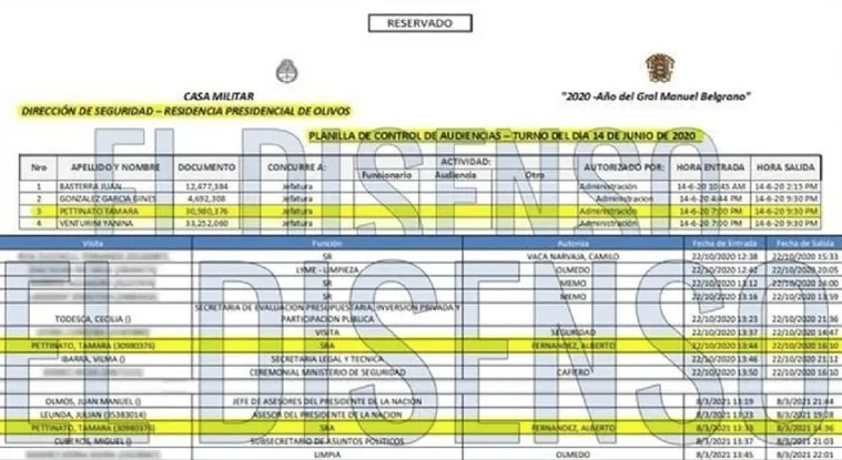 Según el registro de seguridad de la residencia presidencial, la periodista visitó al presidente en junio de 2020 entre las 19 y 21.30 horas y tuvo una audiencia con Fernández. Las otros encuentros fueron el 22 de octubre en Casa Rosada, desde 13.44 a las 16.10 horas y uno más, el Día de la Mujer, en donde estuvo con el mandatario entre las 13.33 y las 14.36 horas.