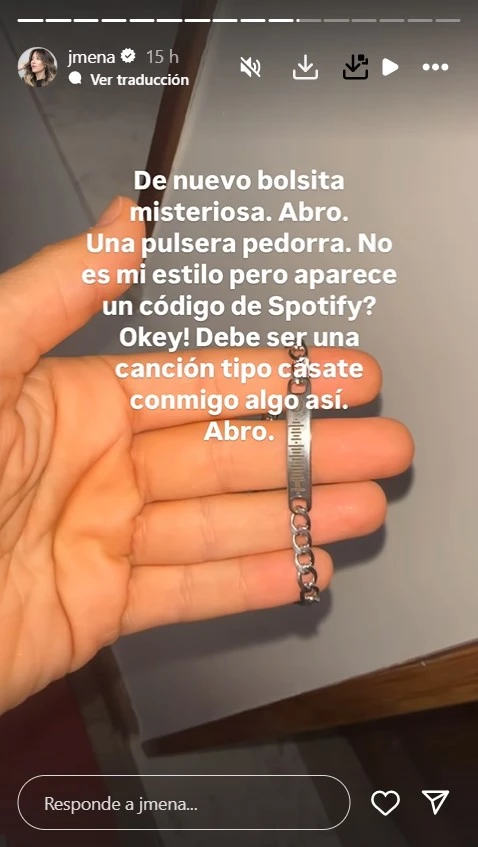 "De nuevo bolsita misteriosa... Abro y era una pulsera pedorra. No es mi estilo pero aparece un código de Spotify. Okey. Debe ser una canción tipo ´cásate conmigo o algo así. y abro´. Era la canción de La Cobra. Le tiró la idea la gente del local", amplió la cantante. "El tipo fue a buscar unos canjes y yo ya tiré 2 ramos imaginarios. Estamos peleados".
