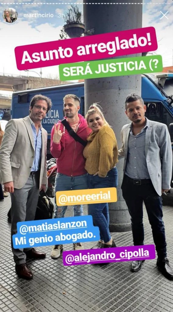 Otra de las condiciones que el muchacho la impuso a Martín fue la imposibilidad de nombrarlo. “Así mismo intimo a que se abstenga de nombrarme en cualquier tipo de medio escrito y/o electrónico, redes sociales, YouTube, Instagram, Faebook, etc. Tanto por mi nombre completo como refiriéndose como ‘mi ex’, ‘mi expareja’, etc. Bajo apercibimiento de iniciar las acciones civiles y penales debidas”, leyó Cirio.