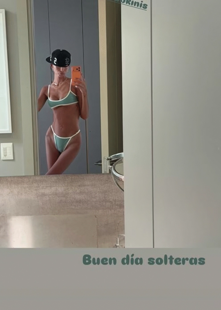La imagen la muestra luciendo una bikini verde claro con vivos blancos y una gorra negra con el número “2” bordado. Sosteniendo su celular naranja y con el rostro parcialmente cubierto por la visera, Juanita escribió en la parte inferior de la foto una frase que descolocó a todos: “Buen día solteras”.
