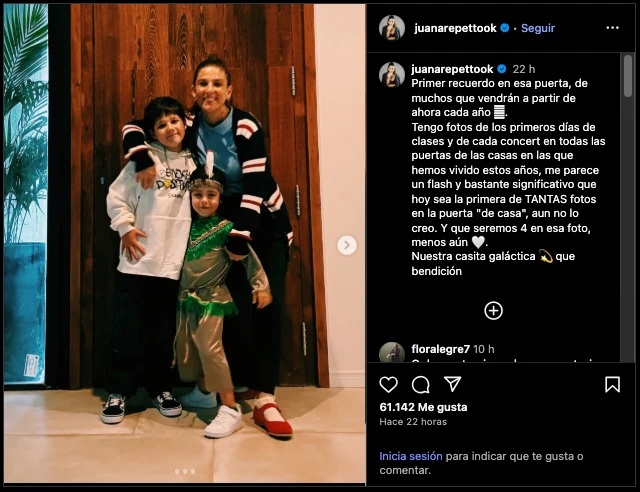 En una serie de fotos con sus dos hijos, Juana escribió: “Primer recuerdo en esa puerta, de muchos que vendrán a partir de ahora cada año. Tengo fotos de los primeros días de clases y de cada concert en todas las puertas de las casas en las que hemos vivido estos años, me parece un flash y bastante significativo que hoy sea la primera de tantas fotos en la puerta ‘de casa’, aún no lo creo. Y que seremos 4 en esa foto, menos aún. Nuestra casita galáctica. Qué bendición”. Clarito, ¿no?
