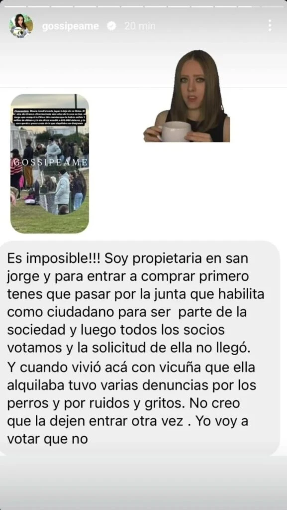 Y entonces dejó caer una durísima acusación sobre la China, del tiempo en el que ella vivió en ese mismo barrio privado cuando estaba en pareja con Vicuña: “Cuando vivió acá con Vicuña, que alquilaban, recibió varias denuncias por los perros, ruidos y gritos. No creo que la dejen entrar otra vez. Yo voy a votar que no”.