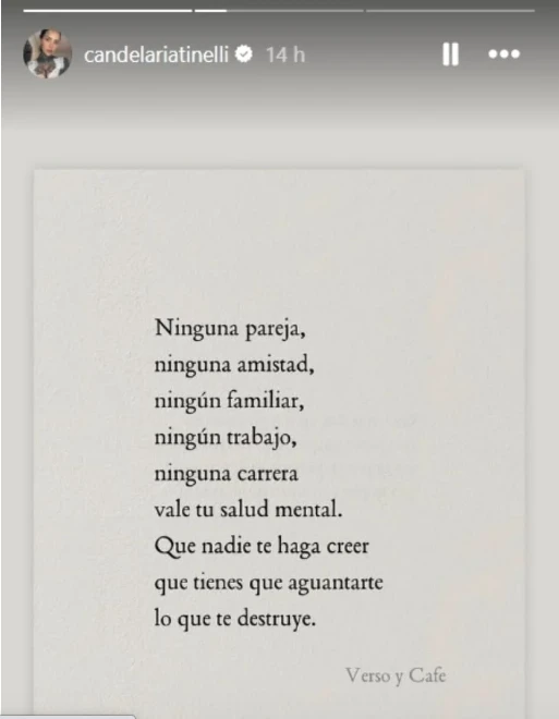 La hija de Marcelo eligió un verso ya publicado, que creó otra persona, pero que evidentemente representa su sentir. Ahí se puede interpretar lo que sucede en su corazón. “Ninguna pareja, ninguna amistad, ningún familiar, ningún trabajo, ninguna carrera vale tu salud mental”, arrancó.