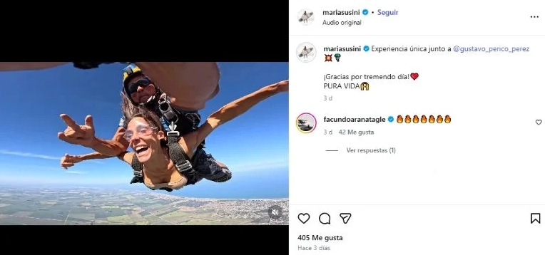 A los pocos días, Susini volvió a hacer un posteo sobre su experiencia al extremo: lanzarse por primera vez en paracaídas. En la publicación escribió: “Experiencia única junto a Gustavo ‘Perico’ Pérez. ¡Gracias por tremendo día! PURA VIDA”. Una vez más, Facundo reaccionó con un like y emojis de fuego.