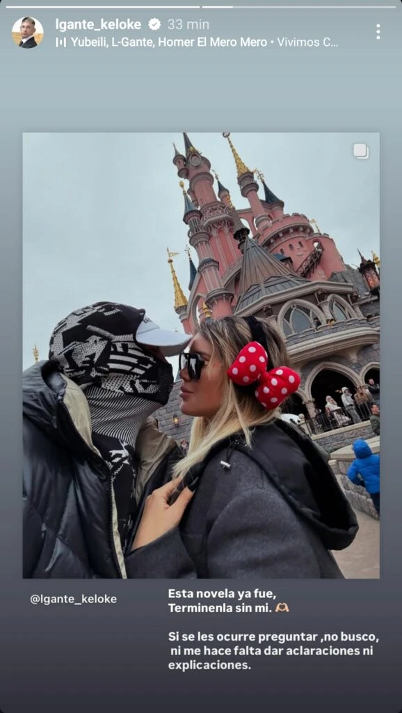 Con una foto de ellos besándose en uno de los parques de Disney, el cantante escribió un contundente mensaje. "Esta novela ya fue, terminenla sin mí. Sí se les ocurre preguntar, no busco, no me hace falta dar aclaraciones ni explicaciones", sentenció Elian Valenzuela.