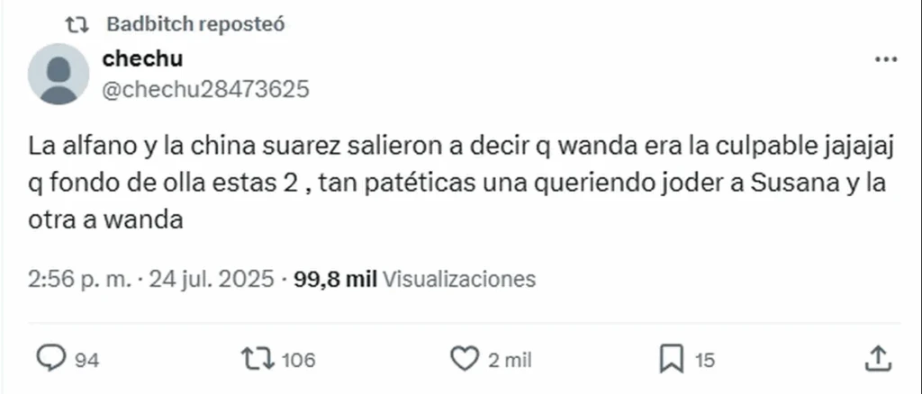 “La Alfano y la China salieron a decir que Wanda era la culpable. jajajaja, ¡qué fondo de olla estas dos! Tan patéticas. Una queriendo joder a Susana y la otra a Wanda”, decía el comentario que Wanda reposteó en su cuenta de X, dejándolo visible en su perfil y avalando las palabras de la usuaria @chechu28473625.