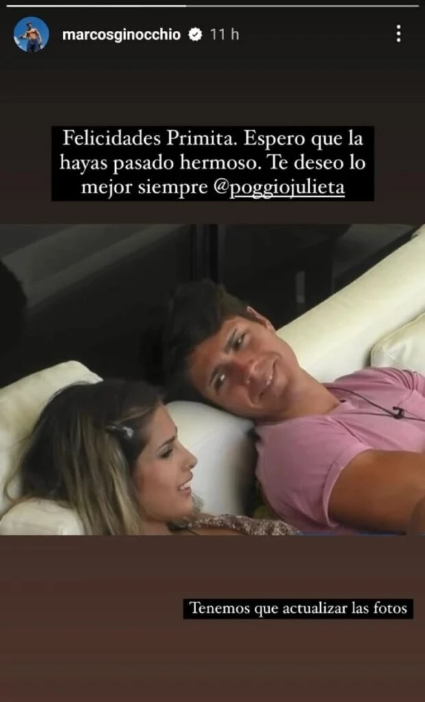 “Felicidades, primita. Espero que la hayas pasado hermoso. Te deseo lo mejor siempre”, fue el mensaje que le escribió Ginocchio, en una publicación donde subió una foto junto a Juli de los tiempos en los que estaban en Gran Hermano. Luego, con mucho sentido del humor y un guiño a los fanáticos, agregó: “Tenemos que actualizar las fotos”.