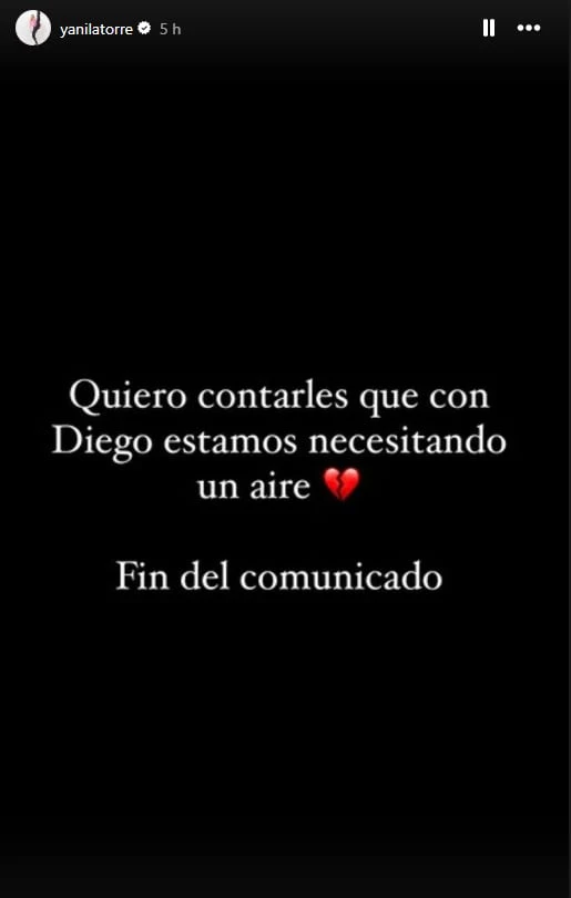 La famosa panelista decidió utilizar sus redes sociales para compartir un posteo en el que dejó un misterioso mensaje sobre su relación con Diego Latorre. Fue entonces que se desataron rumores de separación: “Quiero contarles que con Diego estamos necesitando un aire. Fin del comunicado”.