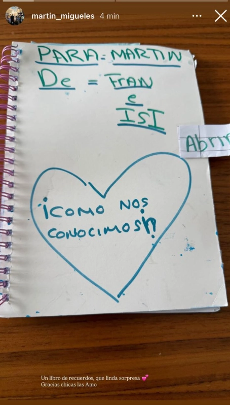 "Un libro de recuerdos, que linda sorpresa. Gracias chicas, las amo", expresó Martín en sus redes junto a las imágenes del tierno obsequio que recibió. Un cuaderno bien artesanal, hecho con sus manos de niñas, en cuya portada se puede leer: "Para Martín. ¿Cómo nos conocimos?".