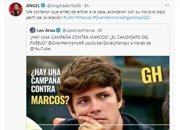 Fue Angel de Brito, conductor de LAM, en las noches de América, quien a través de su cuenta oficial de Twitter reveló el acuerdo que hicieron entre Marcos y Josefina y que explica, tal vez, el comportamiento del jugador con las mujeres que son sus compañeras de programa. "Me contaron que antes de entrar a la casa, acordaron con su novia el bajo perfil de la relación", compartió el periodista, terminando con el misterio en torno a la realidad amorosa del posible candidato a ganar GH.