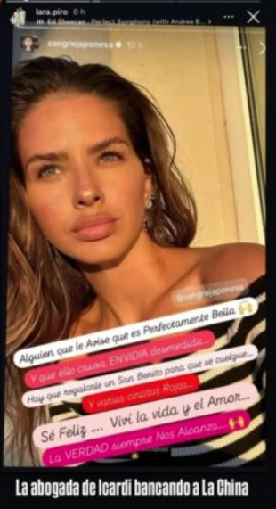 Entonces la letrada dejó en evidencia que algo se cuece en todo el litigio judicial y que además de trabajar con Icardi late en su interior una fascinación por la China. ¿Por qué? Le dedicó unas palabras muy bellas: "Alguien que le avise que es perfectamente bella y que eso causa envidia desmedida. Hay que regalarle un San Benito para que se cuelgue, y varias cintitas rojas".