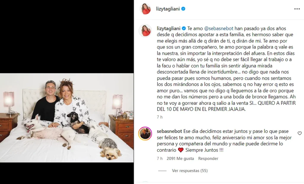 Ahora bien, en medio del escándalo, Lizy Tagliani decidió romper el silencio. Mediante sus redes sociales, la conductora compartió un extenso posteo dedicado a nada más ni nada menos que su esposo a quien le agradeció por aguantar toda la polémica.
