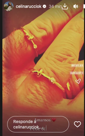 "Amarnos", fue la frase que eligió Celina junto al posteo que hizo en su historial de Instagram donde mostró 2 anillos similares en oro con algunos detalles estéticos que incluyen unas incrustaciones que simbolizan la gran unión de la pareja lleva más de 5 años juntos.