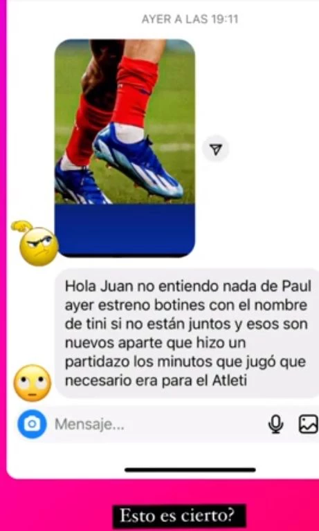 “Hola Juan, no entiendo nada. De Paul ayer estrenó botines con el nombre de Tini. Si no están juntos y esos son nuevos”, mostró Juan Etchegoyen en su cuenta de Instagram, luego de que un hincha le haya enviado ese mensaje y él respondiera: “¿Esto es cierto?”.