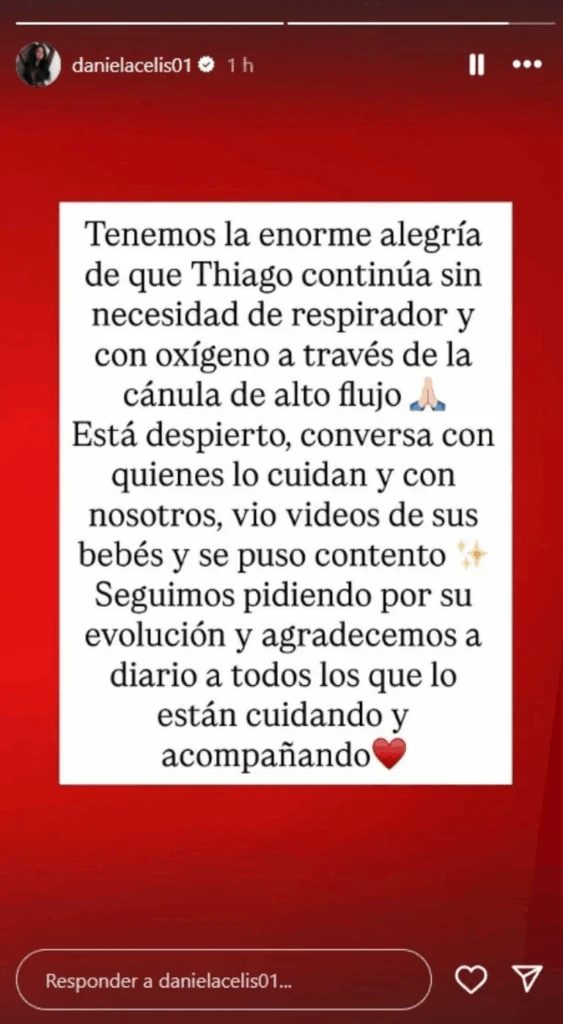 El mensaje abre con una noticia que sus seguidores esperaban leer: “Tenemos la enorme alegría de que Thiago continua sin necesidad de respirador y con oxigeno a través de la cánula de alto flujo”, escribió Daniela. Es decir, ya no requiere asistencia respiratoria mecánica y el soporte se limita al alto flujo, un paso grande en el camino de vuelta.