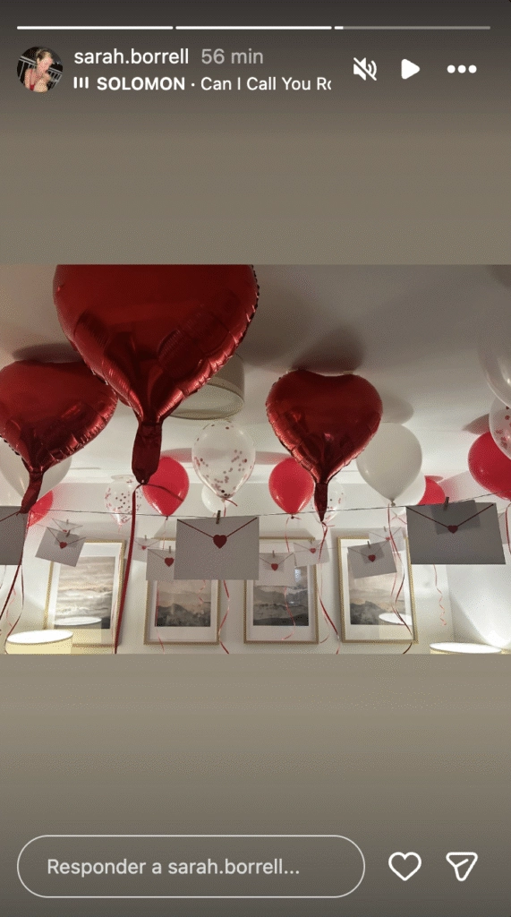 En pleno Día de los Enamorados, cuando las redes sociales se llenaban de declaraciones románticas, Sarah Borrell publicó una historia de Instagram que no pasó inadvertida. La imagen mostraba una habitación decorada con globos rojos en forma de corazón, globos blancos con detalles románticos y sobres colgando con pequeños corazones en el centro. Como fondo musical, sonaba “Can I Call You Rose?”.
