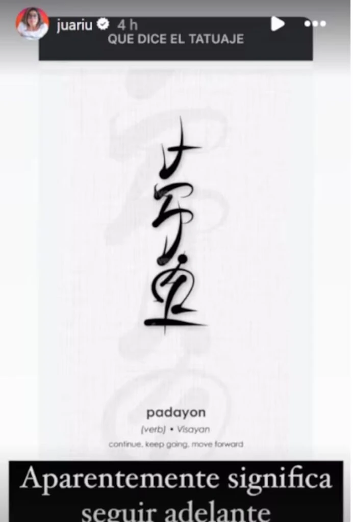 Quien se encargó de blanquear la investigación fue Juariu, que a través de sus redes sociales compartió la imagen del tatuaje y rápidamente sus seguidores descifraron el misterio detrás. Entre ellos, un usuario descifró que el diseño que se hizo el delantero rosarino reza la palabra Padayon, un término que significa “Seguir adelante”.