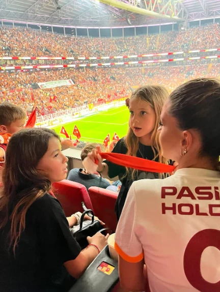 En las postales que publicó se la ve con sus hijos en la platea, rodeada por un mar de banderas rojas y blancas. Luego, un primer plano que dejó ver su look con maquillaje impecable y la camiseta del club turco en primer plano, un gesto claro de apoyo a Icardi y a su nuevo presente. En otra de las imágenes, se la ve relajada junto a una de las niñas, compartiendo una bebida y riéndose a cámara.