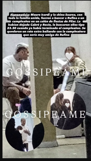La novedad brotó a la luz en la cuenta Gossipeame, merced a la grabación de un curioso que se topó con la pareja feliz y todos sus herederos. “Mauro Icardi y la china Suarez, con toda la familia unida, fueron a buscar a Rufina a un cumpleaños en un salón de fiestas de Pilar”, narró el perfil de Instagram.
