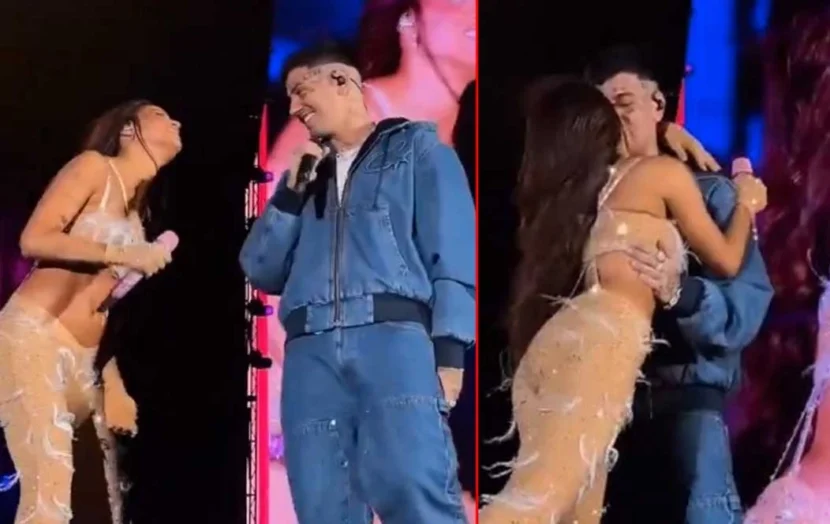 Apareciendo totalmente icónica, arriba de un mp3 y con una puesta en escena tremenda, como siempre tiene acostumbrada Mernes a su público, anunció la hermosa sorpresa junto a Duki que él la acompañaría a cantar el tema “Como si no importara”.