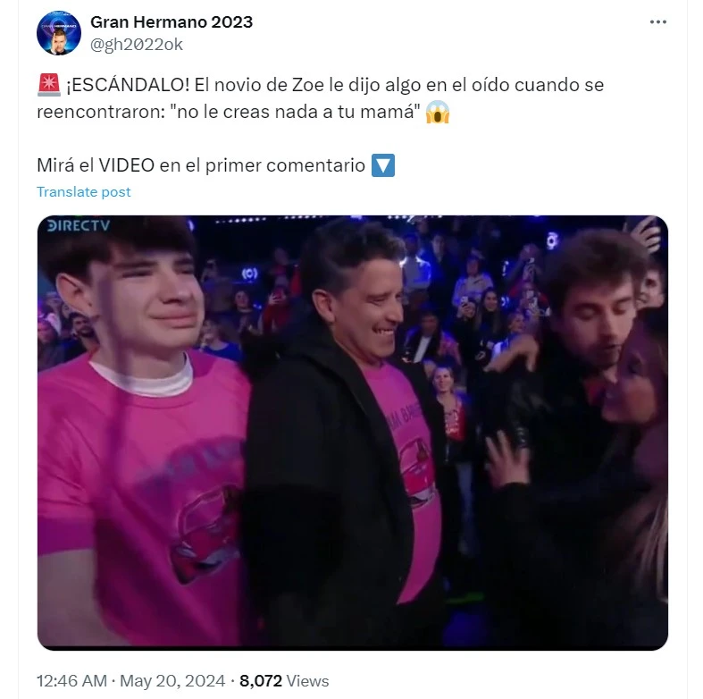 El novio de Zoe, que hasta ahora nunca había aparecido en la pantalla chica como tampoco exponiéndose de más en redes sociales, la saludó y le dijo un misterioso mensaje al oído, que generó todo tipo de especulaciones en redes sociales. Porque muchos creen que el joven le dijo a su novia que "no le crea nada de lo que le dice su mamá".