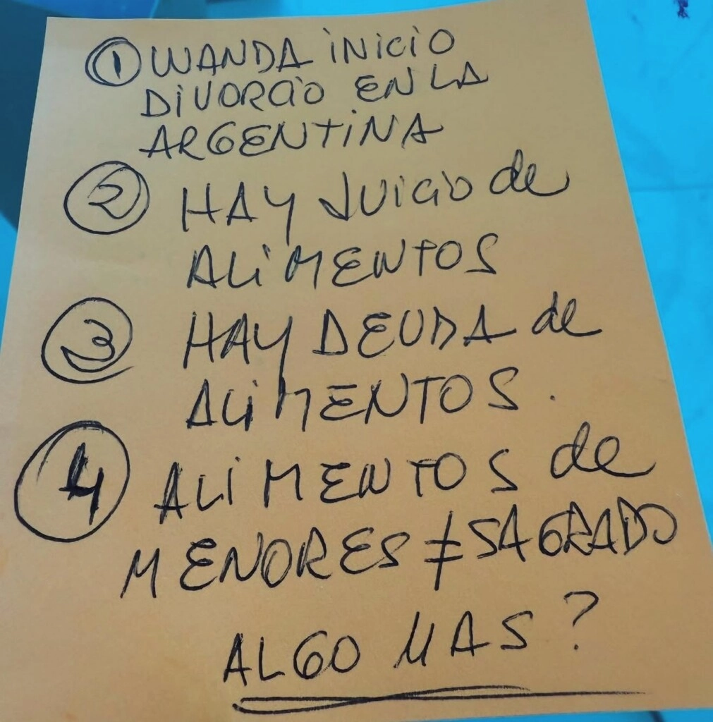 Y entonces enumeró: “1- Wanda inició divorcio en la Argentina”, “2- Hay juicio de alimentos”, “3- Hay deuda de alimentos” y “4- Alimentos de menores ≠ sagrado”. Todas estas cuestiones son procesos legales que Wanda lleva adelante contra Icardi. Y en medio de tantas versiones encontradas y que chocan, la abogada decidió exponerlo todo en un posteo. “¿Algo más?”, cerró de forma sarcástica.