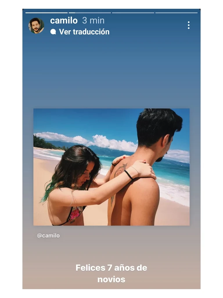 Por el lado de Evaluna, además de las imágenes compartidas, escribió: “¡Siete años de amor con mi esposito! Te amo”. “Te amo”, “Felices siete años de novios”, “Tuyo” y “Para siempre”, fueron las palabras que le dedicó Camilo a su amada y esposa.