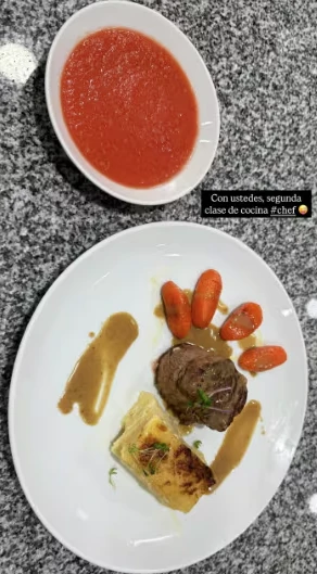 La actriz compartió en sus historias de Instagram una imagen de un plato de sopa de tomate y otro de carne con masa de hojaldre, acompañada por la frase: “Con ustedes, segunda clase de cocina. #Chef”.