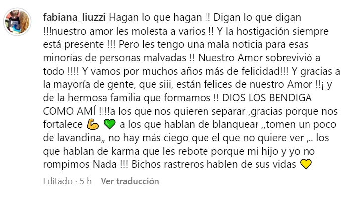 Finalmente, Fabiana Liuzzi dedicó palabras para quienes se encarnizaron con la pareja. “A los que nos quieren separar, gracias, porque nos fortalecen. A los que hablan de blanquear, tomen un poco de lavandina, no hay más ciego que el que no quiere ver”, dijo.
