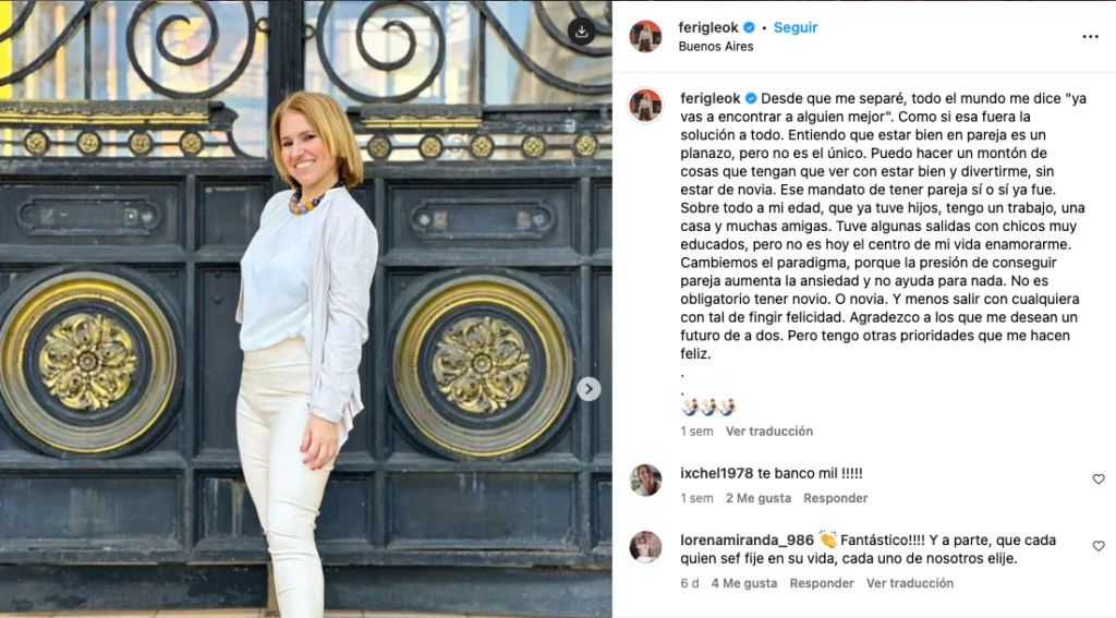 "Ese mandato de tener pareja sí o sí ya fue. Sobre todo a mi edad, que ya tuve hijos, tengo un trabajo, una casa y muchas amigas. Tuve algunas salidas con chicos muy educados, pero no es hoy el centro de mi vida enamorarme... Cambiemos el paradigma, porque la presión de conseguir pareja aumenta la ansiedad y no ayuda para nada. No es obligatorio tener novio. O novia. Y menos salir con cualquiera con tal de fingir felicidad. Agradezco a los que me desean un futuro de a dos. Pero tengo otras prioridades que me hacen feliz".