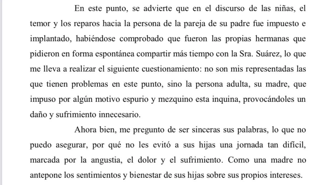 "En este punto, se advierte que en el discurso de las niñas, el temor y los reparos hacia la persona de la pareja de su padre fue impuesto e implantado, habiéndose comprobado que fueron las propias hermanas que pidieron en forma espontánea compartir más tiempo con la Señora Suárez, lo que me lleva a realizar el siguiente cuestionamiento: no son mis representadas las que tienen problemas en este punto, sino la persona adulta, su madre, que impuso por algún motivo espurio y mezquino esta inquina, provocándoles un daño y sufrimiento innecesarios" arranca la parte destacada.