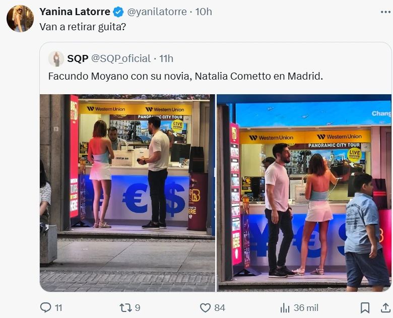 Es que a Facu y Nati los descubrieron en la noche, en la puerta de un Western Union a la calle, un localcito mínimo. “¿Van a retirar guita?”, se preguntó Yanina Latorre, al ver las fotos que publicaron desde la cuenta de su programa, Sálvese quien pueda, en Twitter.